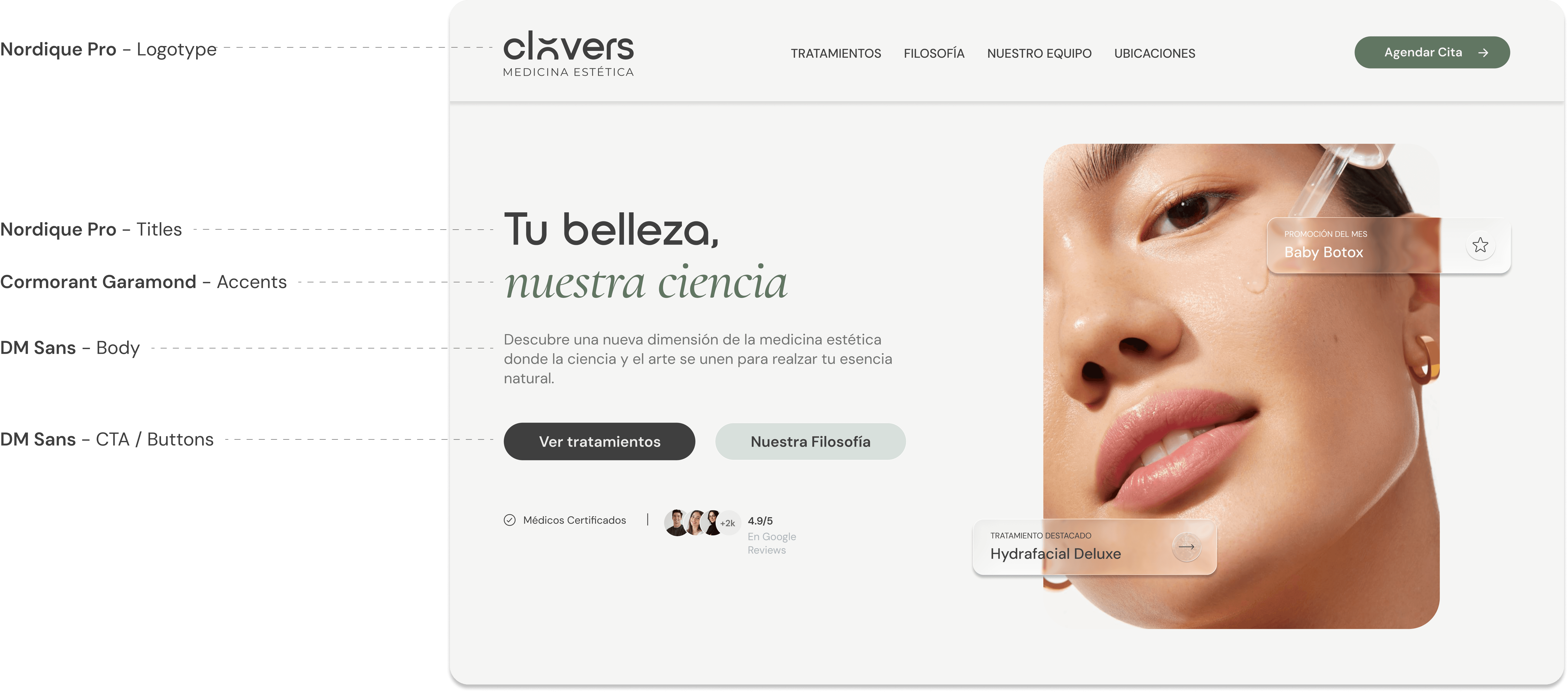 Clovers is a new aesthetic medicine clinic launching in Mexico, built around the belief that beauty is personal, scientific, and timeless. The brand draws its name and philosophy from the clover — a symbol of natural beauty, wellbeing, and good fortune — positioning each patient's experience as something rare and uniquely theirs. The clinic operates across five specialized branches: Clover Skin, Clover Body, Clover Serum, Clover Hair, and Clover Wellness — making brand cohesion and a scalable identity system a core requirement from day one.